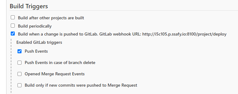 먼저 Build Trigger를 활성화하고 build를 수행할 상황을 체크해줍니다.